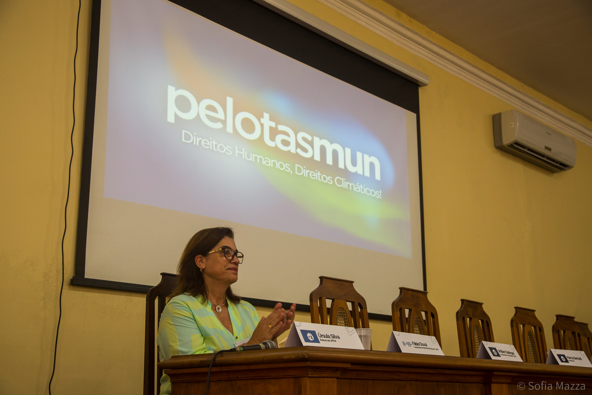 Reitora da UFPel, Ursula Rosa da Silva, presente na cerimônia de abertura do PelotasMUN 2025.