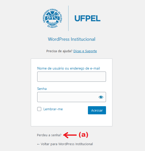 - Na tela de login do WordPress, clique no link Perdeu a senha? (figura abaixo);