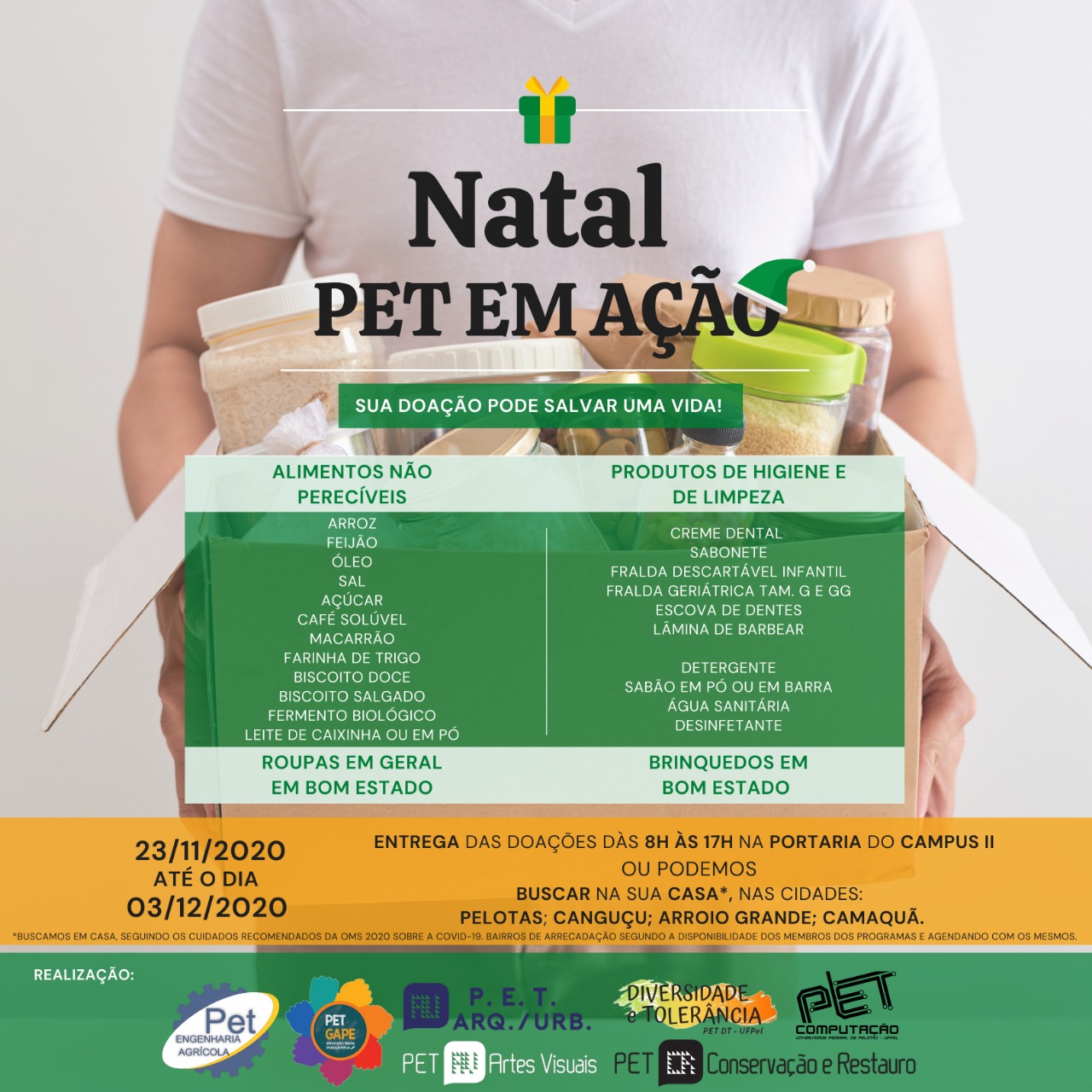“O Natal PET em ação é um projeto desenvolvido pelo PET-EA (Engenharia Agrícola) junto com o PET Artes Visuais, PET Arquitetura, PET Computação, PET Conservação e Restauro, PET Educação e PET GAPE, que tem como objetivo arrecadar alimentos não perecíveis, produtos de higiene e de limpeza, brinquedos e roupas em geral em bom estado, que serão doados para instituições de caridades de Pelotas, Arroio Grande, Canguçu e Camaquã.