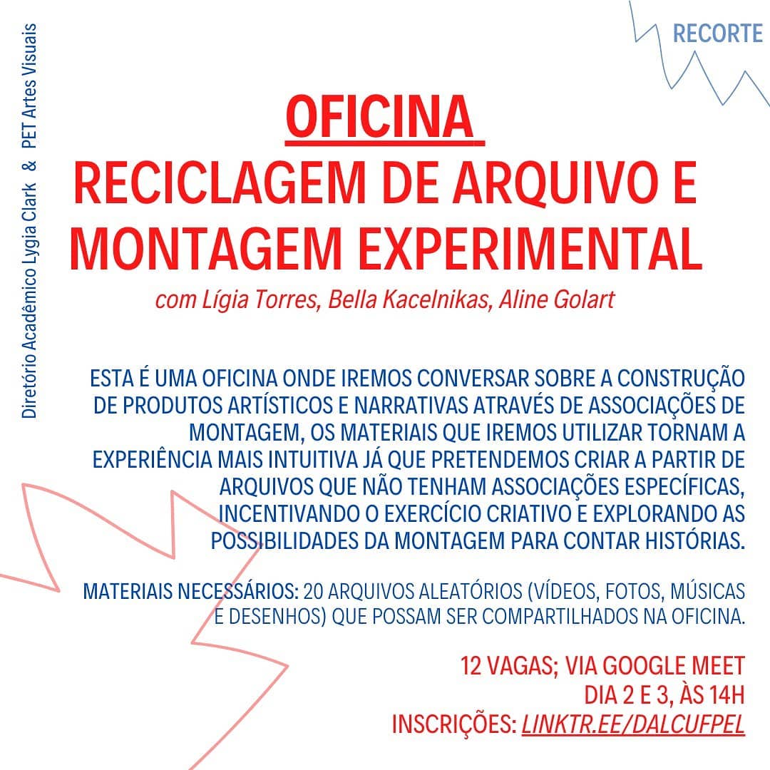RECORTE é uma organização do Diretório Acadêmico Lygia Clark e do PET Artes Visuais para articular pequenos encontros entre estudantes do Centro de Artes da UFPel em formato de oficinas e rodas de conversas, na intenção de estimular a prática artística e a conversa entre os discentes.