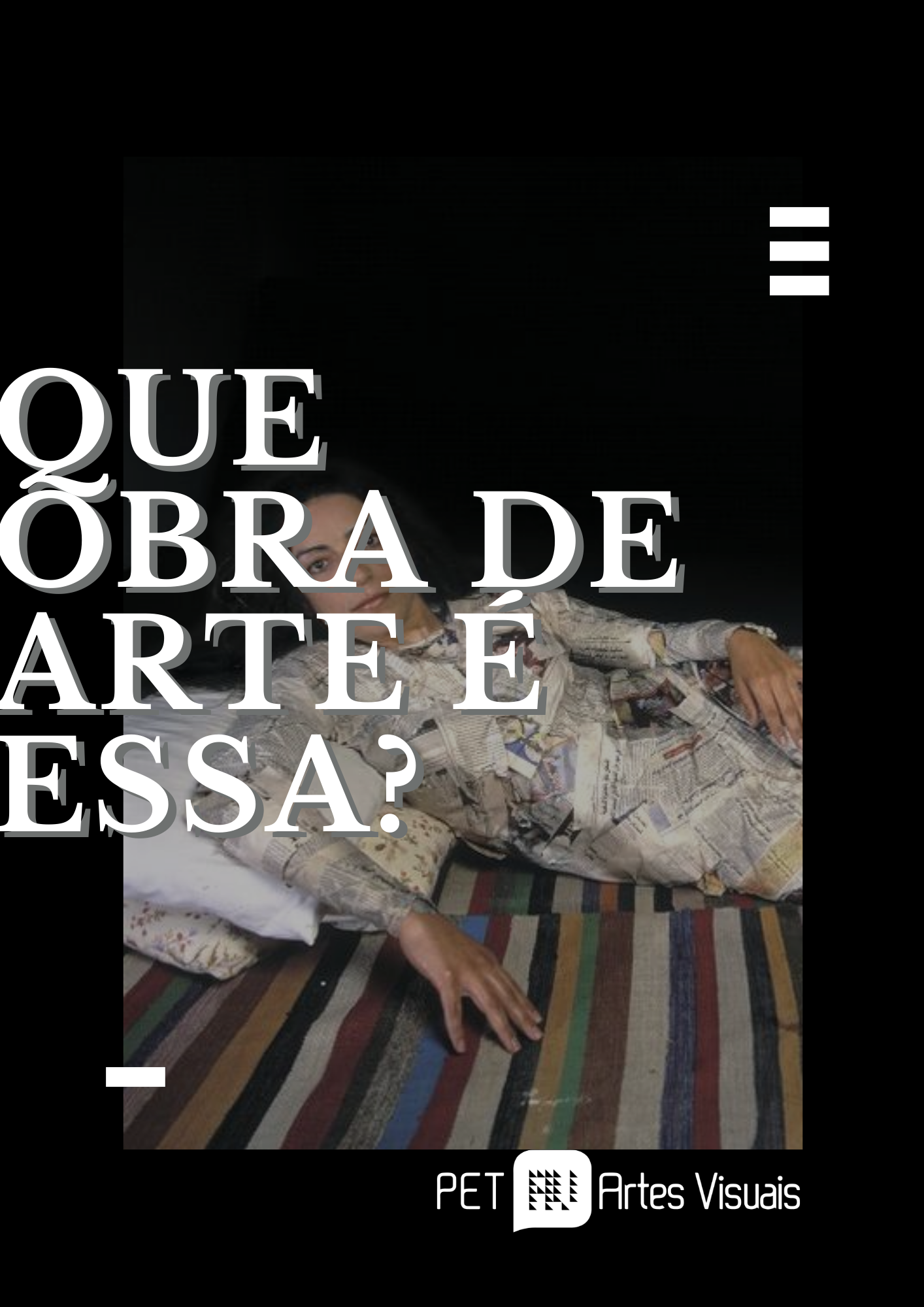 ‘Que obra de arte é essa?’ é um quiz feito pela petiana Vanessa Dias, acontece através da rede social Instagram do PET Artes Visuais, lançado sempre as sextas-feiras as 17h, com uma obra de uma artista diferente. As perguntas são em relação a obra e a artista, podendo ter dicas, enquete, caixa de feedback, música, figurinhas, imagens, texto, etc., sendo livre a forma de perguntar e provocar aproximações para interagir melhor com o público. Um dia depois de lançadas as perguntas, são postadas as respostas em formato de texto, não ultrapassando 4 parágrafos. Nesses breves textos a petiana apresenta um pouco da biografia da artista, notas sobre o trabalho apresentado e sobre o tema que a artista aborda em sua poética, podendo aparecer trechos de entrevistas com a própria fala da artista.