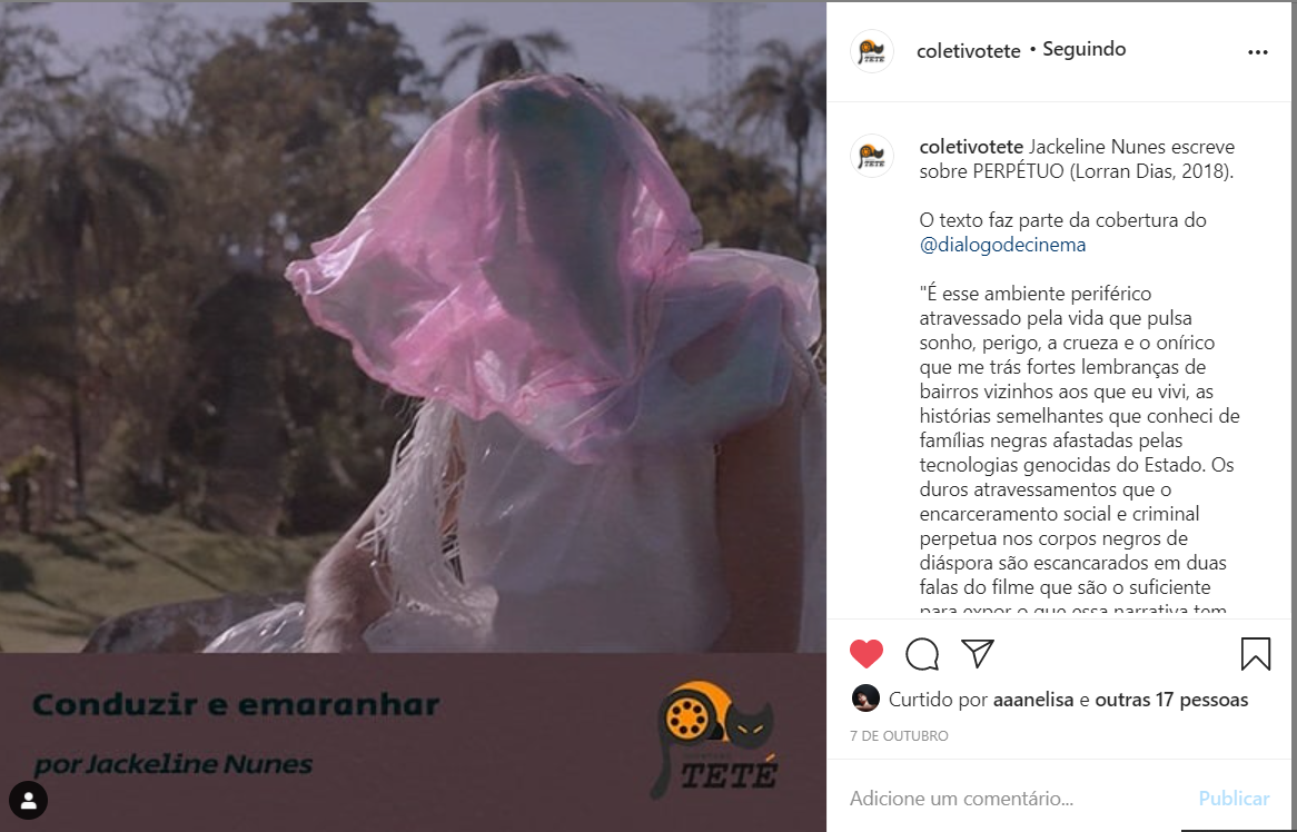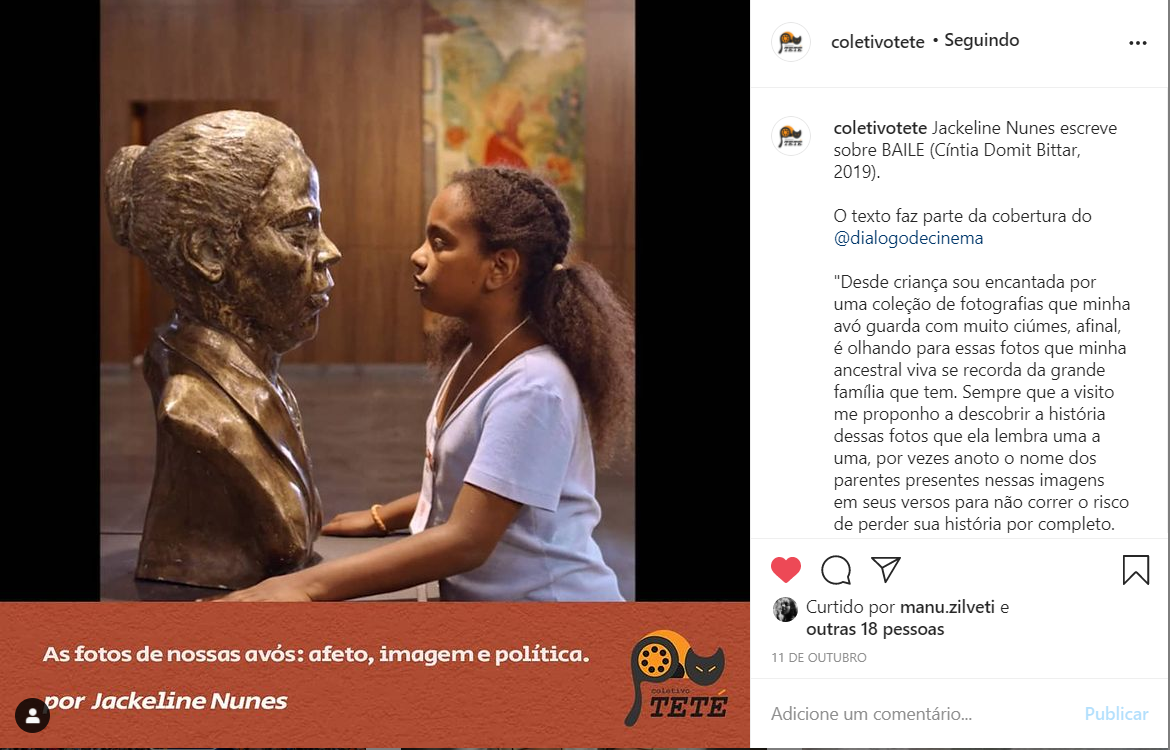 A petiana Jackeline Nunes é integrante do Coletivo Teté e escreveu duas coberturas críticas para o festival, que estão disponíveis clicando nestes links: Conduzir e emaranhar ; As fotos de nossas avós: afeto, imagem e política