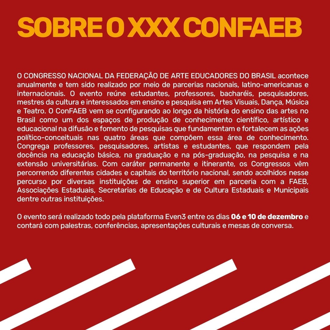 As inscrições para a II Mostra Virtual Internacional estarão abertas entre 19 de outubro e 19 de novembro de 2021 e tem o objetivo selecionar trabalhos em vídeo e fotografia para ocupar o perfil do evento no Instagram durante todo o período de realização do XXX CONFAEB, contando também com uma noite de exibição dos trabalhos projetados no centro histórico de Pelotas-Rs. A inscrição para a exposição é gratuita e implica no consentimento nas normas do edital e na cessão dos direitos para reprodução e exibição, total ou parcial, em todas as atividades de promoção e divulgação da exposição. A avaliação das produções será realizada por uma comissão artística e acadêmica oriunda da UFPEL.