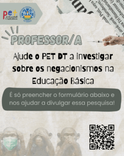 O objetivo do Projeto de Pesquisa “Negacionismos na Educação Básica”, do PET Diversidade e Tolerância da UFPel, é compreender os desafios enfrentados no cotidiano escolar em relação à desinformação, aos negacionismos e a falta de regulação das plataformas virtuais, bem como refletir sobre as possibilidades de integrar essas temáticas ao currículo, de forma significativa e formativa. Sua contribuição, inteiramente anônima, é essencial para esta pesquisa acadêmica, que busca fortalecer o debate sobre o papel da escola no combate aos negacionismos e às fake news.