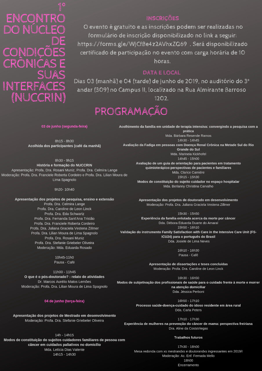O Programa de Pós-Graduação em Enfermagem da UFPel divulga o resultado do Edital de Seleção para Alunos Especiais da disciplina “Seminário em Enfermagem e Saúde XIX: Boas práticas em saúde mental no contexto da desinstitucionalização”, para o semestre 2019-1:
