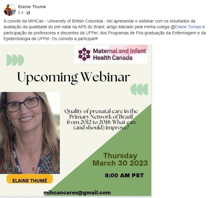 A convite da MIHCan – University of British Columbia – a professora do PPGEnf. Dra. Elaine Thumé irá apresentar o webinar com os resultados da avaliação da qualidade do pré-natal na APS do Brasil, artigo liderado pela sua colega Dra. Elaine Tomasi e que conta com a participação de professores e discentes da UFPel, dos Programas de Pós-Graduação da Enfermagem e da Epidemiologia.