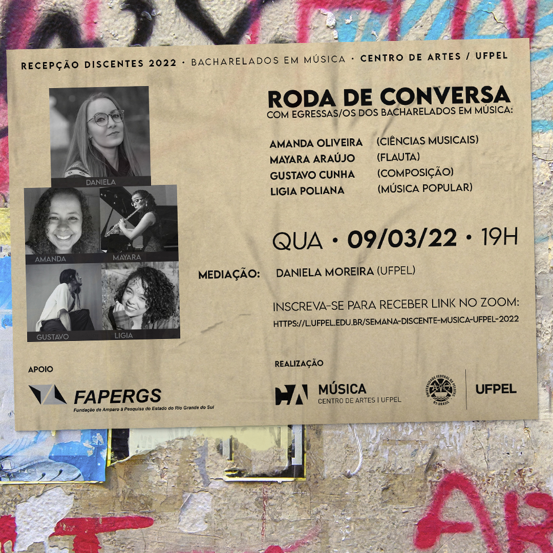 QUARTA 09/03 – 19h – Roda de conversa com egressas/os dos Bacharelados em Música: Amanda Oliveira (Ciências Musicais); Ligia Poliana (Música popular); Mayara Araújo (Flauta) e Gustavo Cunha (Composição)