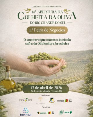 A 14ª Abertura Oficial da Colheita da Oliva acontece no dia 17 de abril, em Triunfo (RS), reunindo produtores, especialistas e o público para celebrar uma safra que promete ser histórica. A estimativa é de que o Brasil produza cerca de 1 milhão de litros de azeite em 2026, sendo aproximadamente 800 mil litros no Rio Grande do Sul, principal polo produtor do país.