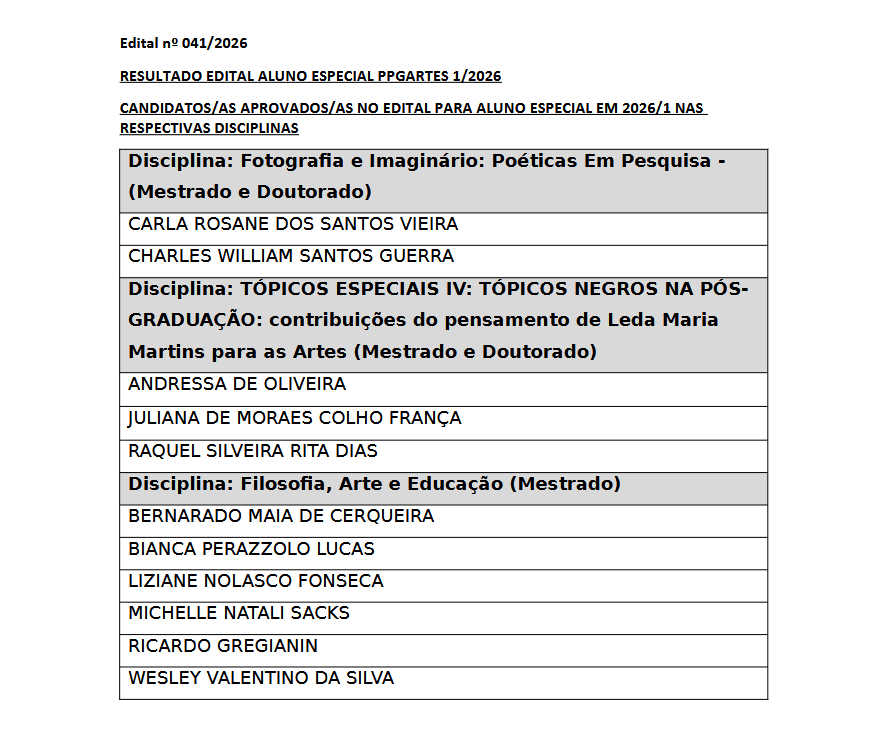 Divulgação da lista da turma de Alunos Regulares ingressantes em 2026/1 no curso Doutorado em Artes do Programa de Pós-Graduação em Artes (PPGARTES), da Universidade Federal de Pelotas (UFPel), com seus respectivos Professores Orientadores.