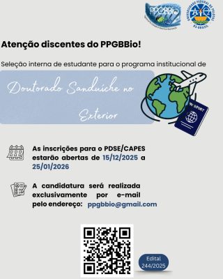 PPGBBio abre seleção interna para o programa institucional de doutorado sanduíche no exterior. Inscrição: 15/12/2025 a 25/01/2026, exclusivamente pelo e-mail do PPG – ppgbbio@gmail.com