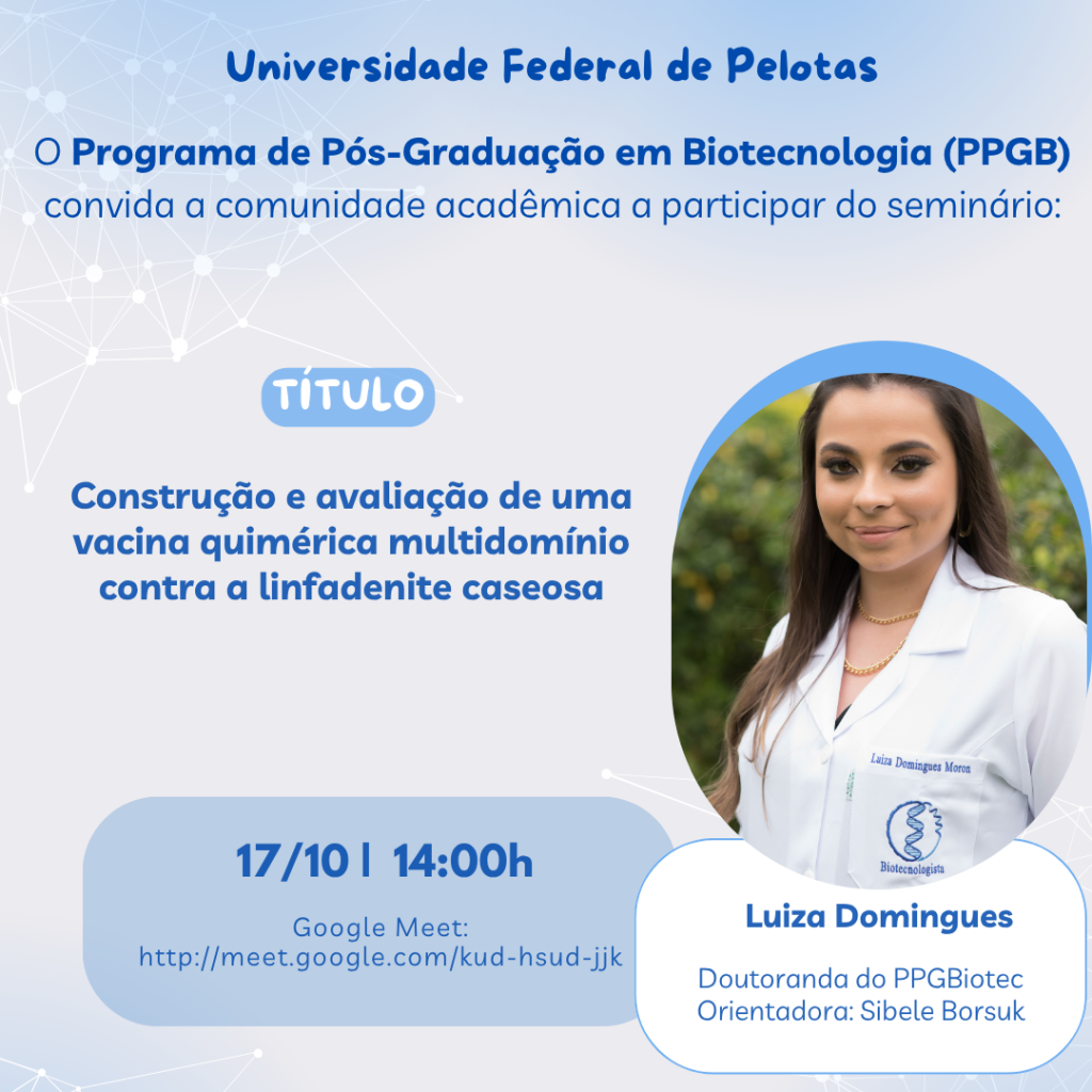 Prezados(as), O Programa de Pós-Graduação em Biotecnologia convida a todos para a aula de boas-vindas das disciplinas de Seminários, dos cursos de Mestrado e Doutorado, a ser realizada nesta sexta-feira, 19 de setembro de 2025, às 14 horas. O encontro marcará o início das atividades das disciplinas neste semestre. Link de acesso à aula: solicitar para o e-mail: fred.s.kremer@gmail.com Contamos com sua participação! Atenciosamente,