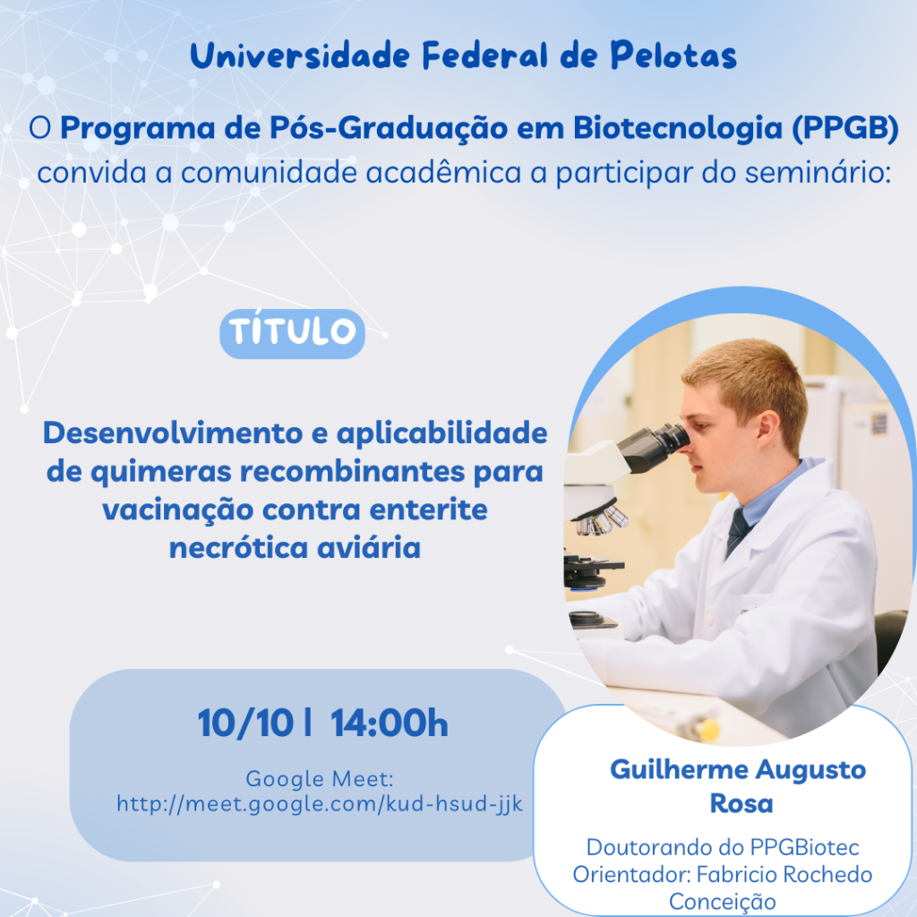 Local: Webconferência e Sala de aula do PPGBiotec, do prédio 19, no Campus Capão do Leão