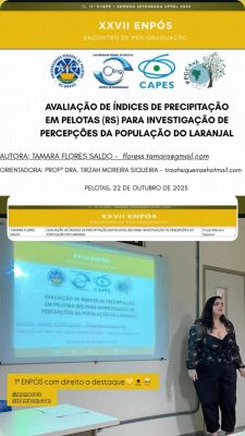 • Trabalho em Destaque no XXVII ENPÓS – SIIEPE/UFPel 2025 – “Avaliação de Índices de Precipitação em Pelotas (RS) para Investigação de Percepções da População do Laranjal”