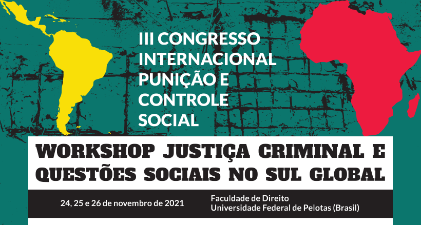 Nos dias 24, 25 e 26 de novembro de 2021, será realizado o III Congresso Internacional Punição e Controle Social – Workshop Justiça Criminal e Questões Sociais no Sul Global. Que pretende reunir profissionais, docentes e pesquisadoras e pesquisadores sobre a justiça criminal e as questões sociais e humanas em experiências históricas e perspectivas a partir do sul global. A proposta é unir contribuições na tentativa de prosseguir no debate sobre a conjectura da justiça criminal (e seus atores) na contemporaneidade, como também no reflexo às questões sociais diante das desigualdades, vulnerações e violências que envolvem diferentes jurisdições e contextos, no âmbito da América Latina e África, mas também em outras dimensões d(e)o Sul.