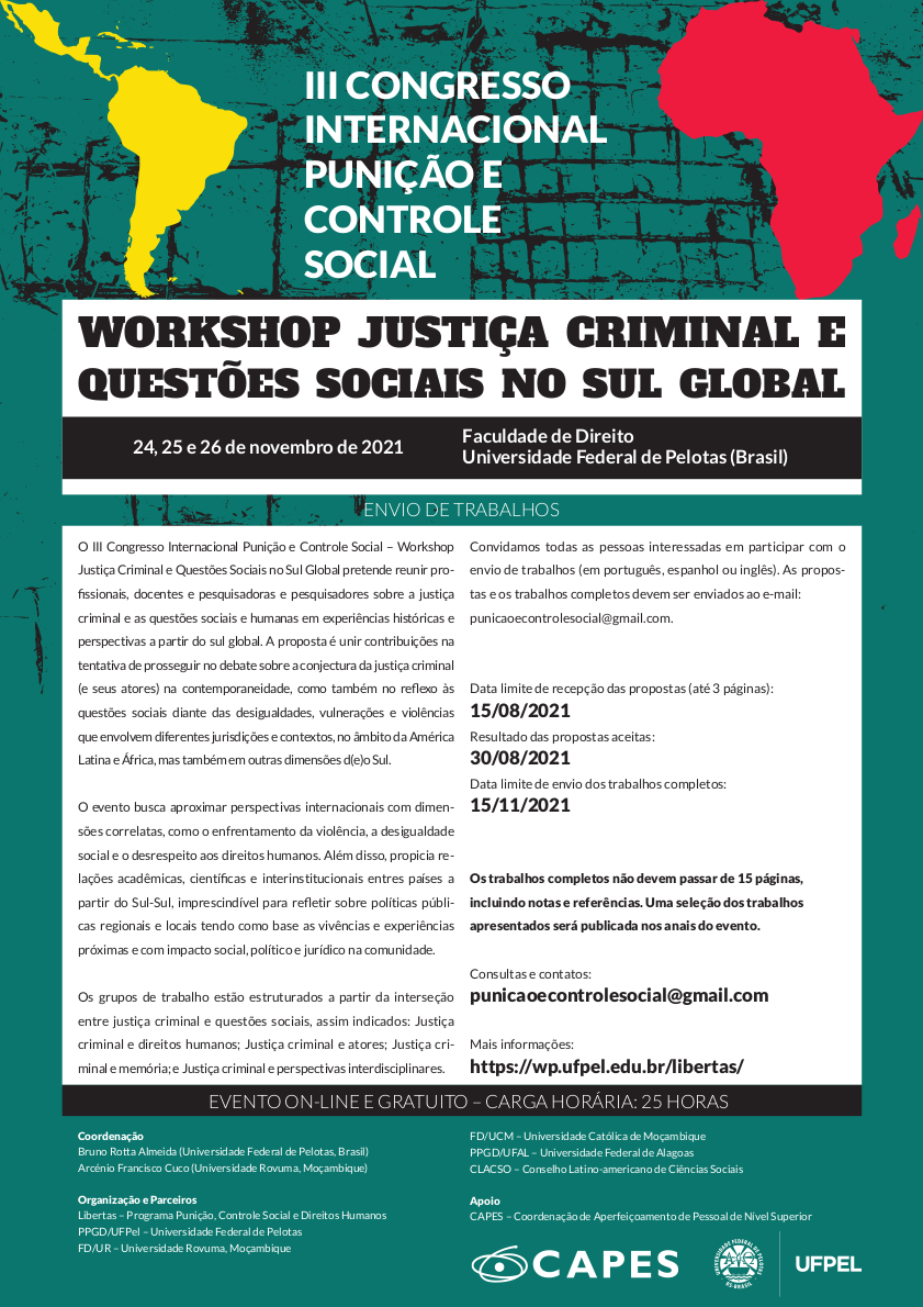 Saiba mais em: https://wp.ufpel.edu.br/libertas/eventos/workshop-justica-criminal-e-questoes-sociais-no-sul-global-iii-congresso-internacional-punicao-e-controle-social/