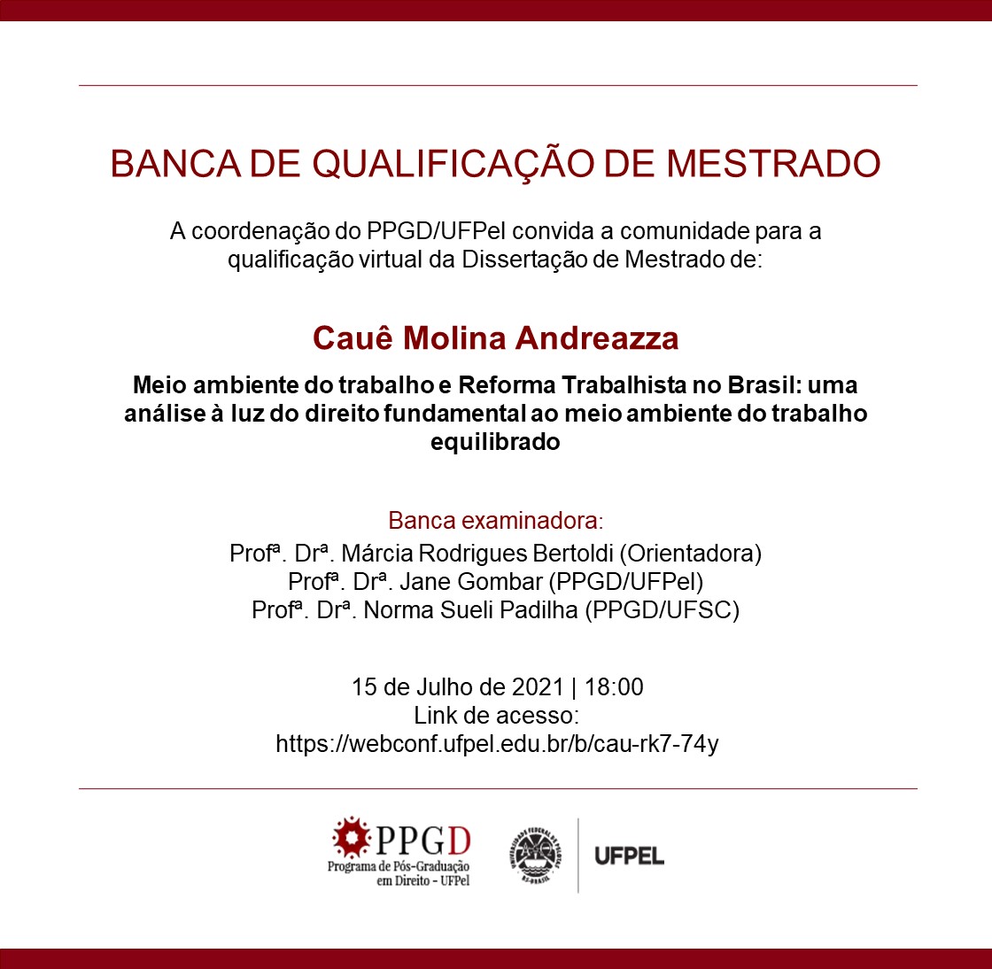 A Coordenação do PPGD/UFPel convida a comunidade para a banca de qualificação da dissertação “Meio ambiente do trabalho e Reforma Trabalhista no Brasil: uma análise à luz do direito fundametnal ao meio ambiente do trabalho equilibrado” do aluno Cauê Molina Andreazza, acessível pelo link https://webconf.ufpel.edu.br/b/cau-rk774y. A qualificação ocorrerá no dia 15 de julho de 2021 às 18 horas.