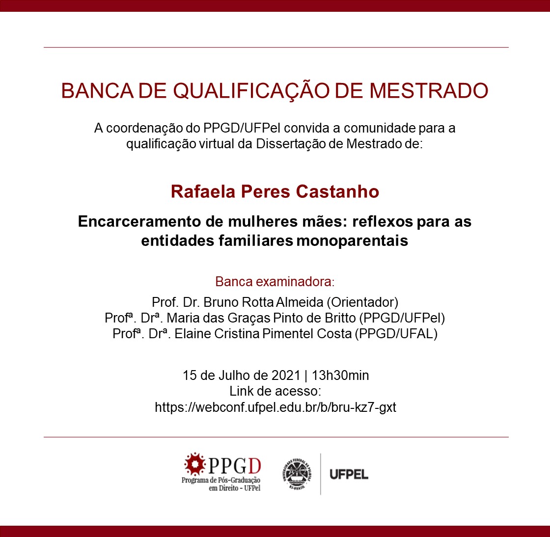 A Coordenação do PPGD/UFPel convida a comunidade para a banca de qualificação da dissertação “Encarceramento de mulheres mães: reflexos para as entidades familiares monoparentais” da aluna Rafaela Peres Castanho, acessível pelo link https://webconf.ufpel.edu.br/b/bru-kz7-gxt. A qualificação ocorrerá no dia 15 de julho de 2021 às 13 horas e 30 minutos.