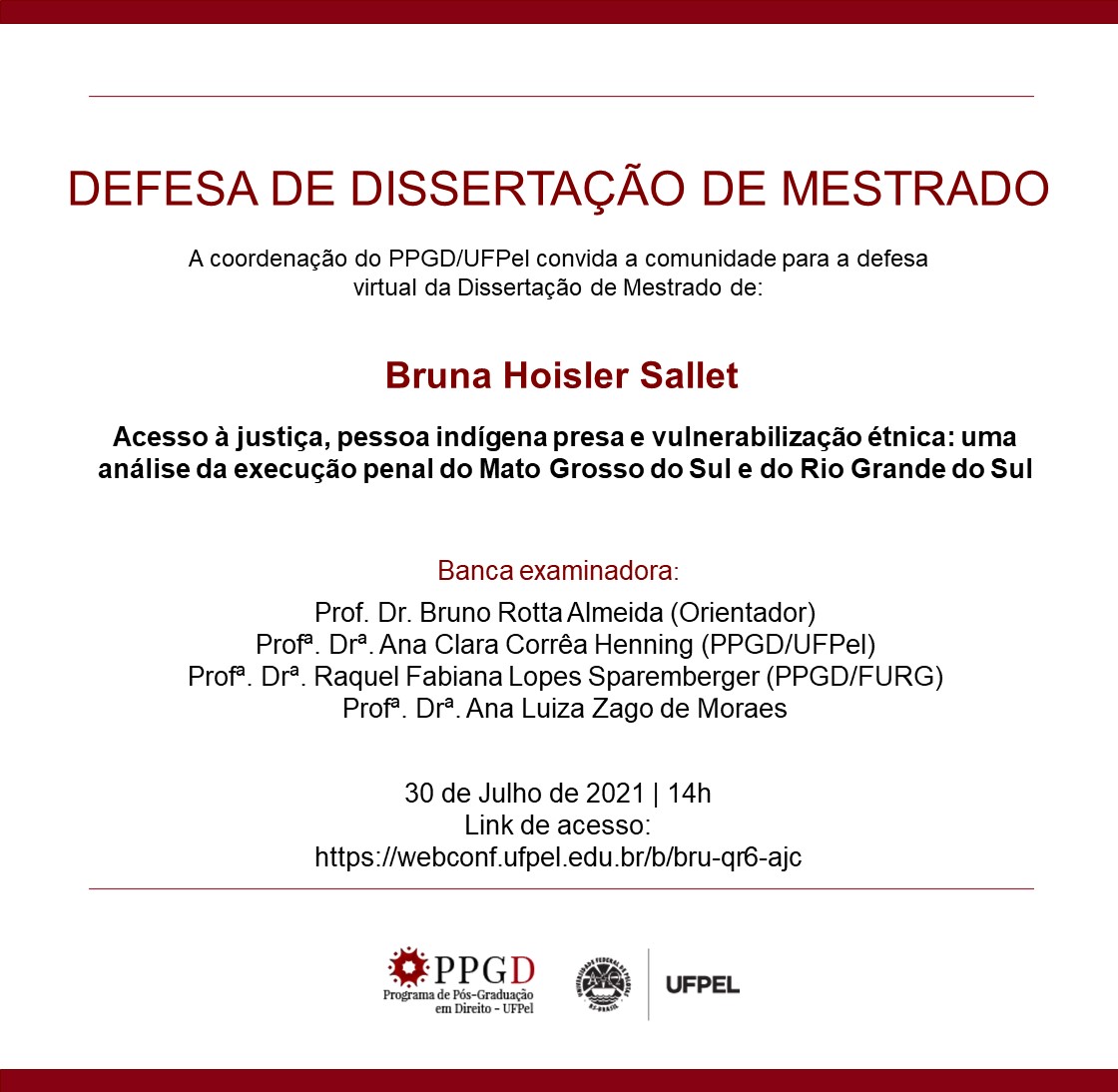 A Coordenação do PPGD/UFPel convida a comunidade para a defesa da dissertação de Bruna Hoisler Sallet intitulada “Acesso à justiça, pessoa indígena presa e vulnerbilização étnica: uma análise da execução penal do Mato Grosso do Sul e do Rio Grande do Sul”, que ocorrerá no dia 30 de julho de 2021 às 14 horas e pode ser acessada pelo link https://webconf.ufpel.edu.br/b/bru-qr6-ajc