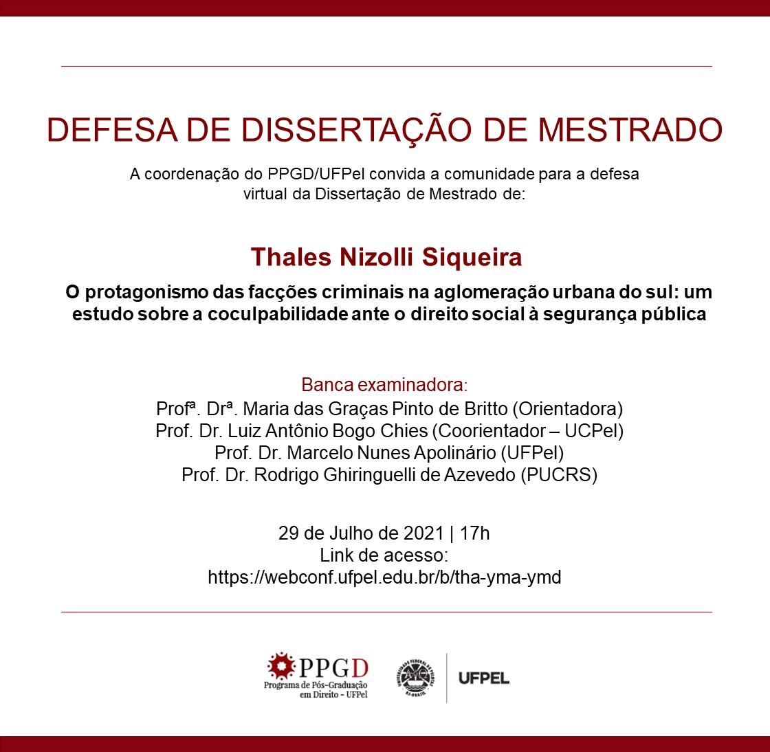 A Coordenação do PPGD/UFPel convida a comunidade para a defesa da dissertação de Thales Nizolli Siqueira intitulada “O protagonismo das facções criminais na aglomeração urbana do sul: um estudo sobre a coculpabilidade ante o direito social à segurança pública”, que ocorrerá no dia 29 de julho de 2021 às 17 horas e pode ser acessada pelo link https://webconf.ufpel.edu.br/b/tha-yma-ymd.