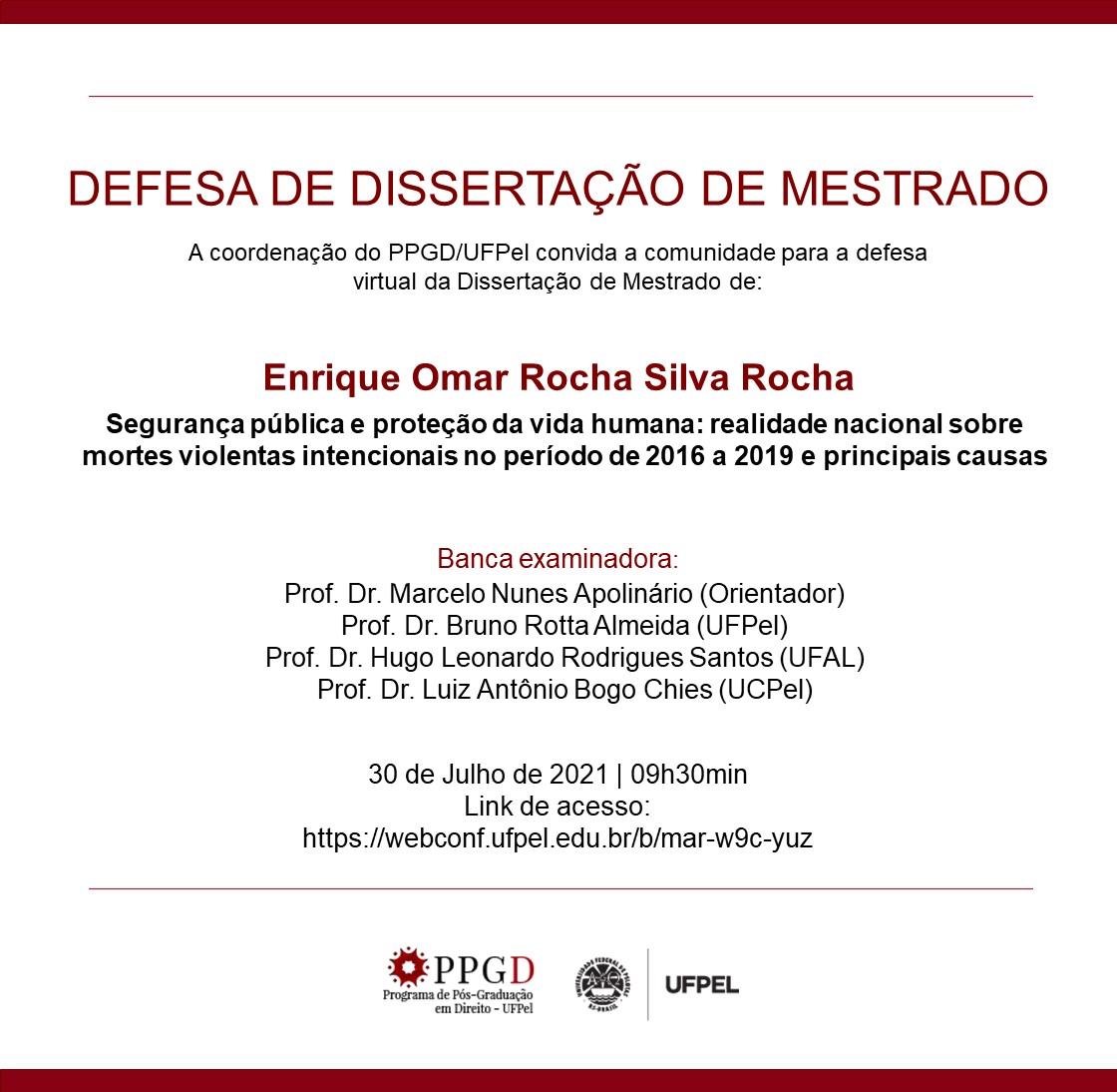 A Coordenação do PPGD/UFPel convida a comunidade para a defesa da dissertação de Enrique Omar Rocha Silva Rocha intitulada “Segurança pública e proteção da vida humana: realidade nacional sobre mortes violentas intencionais no período de 2016 a 2019 e principais causas”, que ocorrerá no dia 30 de julho de 2021 às 09 horas e 30 minutos e pode ser acessada pelo link https://webconf.ufpel.edu.br/b/mar-w9c-yuz.