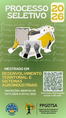 O Programa de Pós-Graduação em Desenvolvimento Territorial e Sistemas Agroindustriais (PPGDTSA), da Universidade Federal de Pelotas (UFPel), promoverá a décima edição do seu seminário anual nos dias 21 e 22 de outubro de 2025, das 8h30 às 18h, no Campus Anglo, em Pelotas/RS.