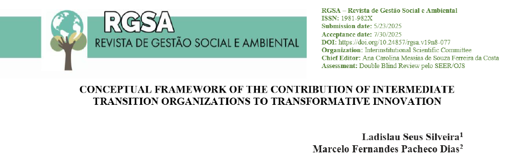Parabenizamos o pesquisador Ladislau Seus Silveira e o professor Dr. Marcelo Fernandes Pacheco Dias pela publicação do trabalho Conceptual framework of the contribution of intermediate transition organizations to transformative innovation na revista de gestão social e ambiental, RGSA.