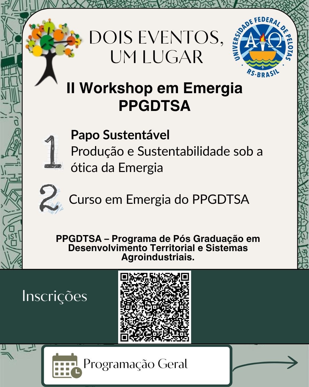 Teremos, entre os dias 14 e 17 de julho de 2025, a realização do II Workshop em Emergia, composto por duas atividades principais: o seminário Papo Sustentável e o II Curso em Emergia do PPGDTSA
