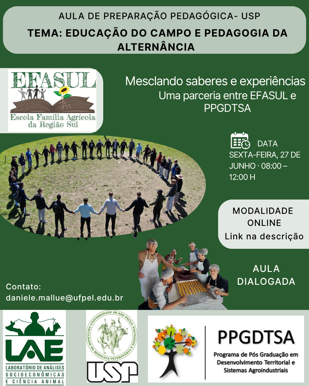 No próximo dia 27 de junho, das 8h às 12h, o PPGDTSA participará, em parceria com a EFASUL, da aula de Preparação Pedagógica do Departamento de Nutrição e Produção Animal da USP, sob coordenação do Professor Augusto Hauber Gameiro.