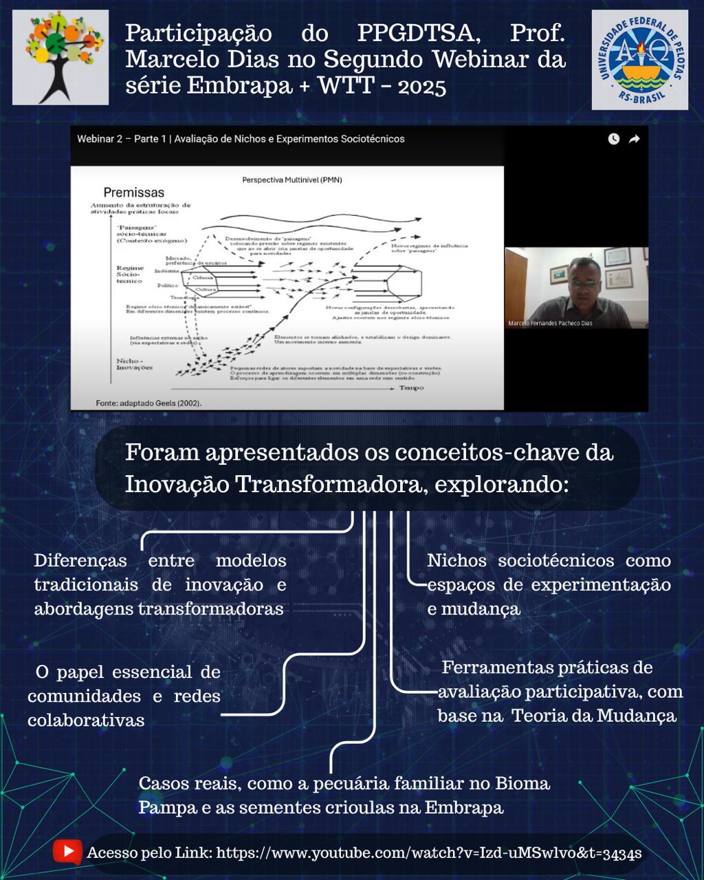 O Prof. Marcelo Dias representou o Programa de Pós-Graduação em Desenvolvimento Territorial e Sistemas Agroindustriais (PPGDSTA/UFPel) no Segundo Webinar da série Embrapa + WTT, com o tema Avaliação de Nichos e Experimentos Sociotécnicos