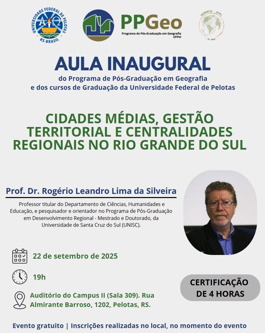 O Programa de Pós-GraduaO Programa de Pós-Graduação em Geografia (PPGeo/UFPel) e os cursos de Graduação em Geografia da UFPel convidam todos os alunos (ingressantes e regulares) e comunidade em geral, para a Aula Inaugural do semestre 2025/2. O encontro contará com a palestra do Prof. Dr. Rogério Leandro Lima da Silveira (UNISC), que abordará o tema “Cidades médias, gestão territorial e centralidades regionais no Rio Grande do Sul”. O evento acontece no dia 22 de setembro de 2025, às 19h, no Auditório do Campus II (Sala 309), Rua Almirante Barroso, 1202, Pelotas/RS. A participação é gratuita, com inscrições realizadas no local, no momento do evento, e dará direito à certificação de 4 horas. Será um momento de integração e reflexão importante para toda a comunidade acadêmica. Participe!ção em Geografia (PPGeo/UFPel) e os cursos de Graduação em Geografia da UFPel convidam todos os alunos (ingressantes e regulares) e comunidade em geral, para a Aula Inaugural do semestre 2025/2.