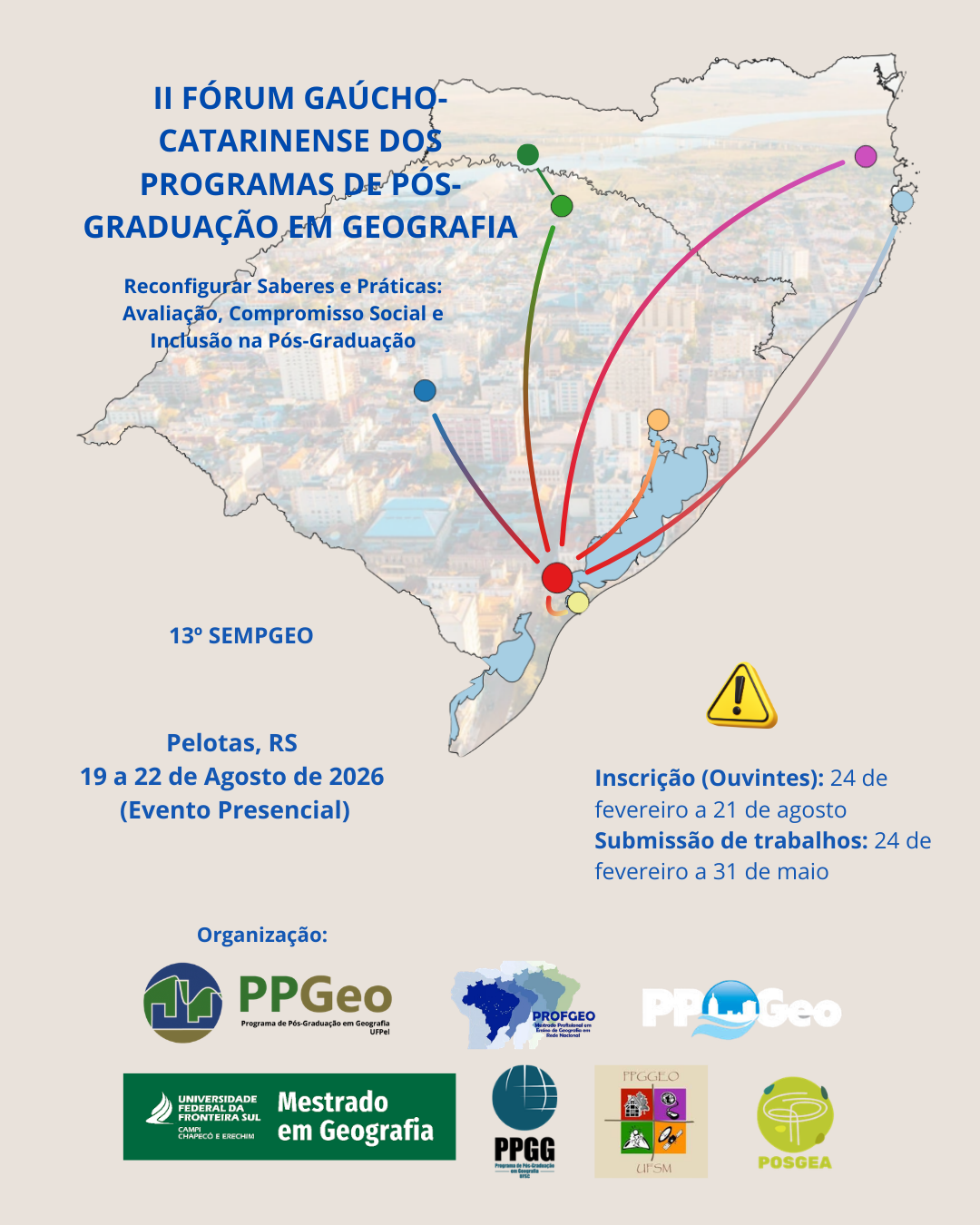 De 19 a 22 de agosto de 2026, a Universidade Federal de Pelotas será palco do II Fórum Gaúcho-Catarinense dos Programas de Pós-Graduação em Geografia, realizado conjuntamente ao XIII Seminário do Programa de Pós-Graduação em Geografia da UFPel (XIII SEMPGEO). Nesta edição, celebramos um marco histórico: a abertura do Curso de Doutorado em Geografia da UFPel, consolidando o fortalecimento e a interiorização da pós-graduação em Geografia no sul do Brasil. O evento reúne os Programas de Pós-Graduação em Geografia do RS e de SC — […]