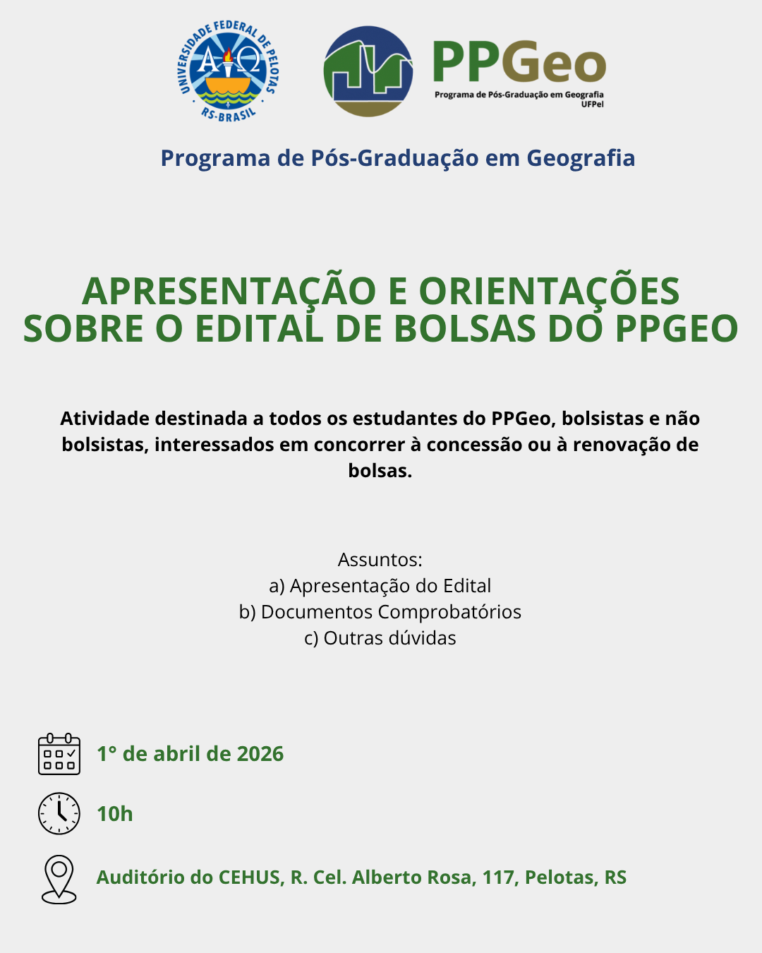 A Coordenação do Programa de Pós-Graduação em Geografia da Universidade Federal de Pelotas (PPGeo/UFPel) realizará uma atividade de apresentação e orientações acerca do edital de concessão e renovação de bolsas, destinada a todos os estudantes do Programa, bolsistas e não bolsistas.