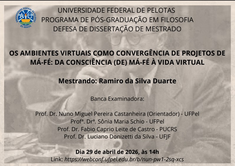 O Programa de Pós-Graduação em Filosofia informa que estão abertas as inscrições para alunos especiais no período 22 a 27 de março de 2026. Podem se inscrever graduados e prováveis formandos interessados em cursar disciplinas isoladas do Programa. A seleção seguirá os critérios do Programa, conforme o Edital abaixo. Para mais informações e orientações sobre documentação, entre em contato pelo e‑mail ppgfilosofiaufpel@gmail.com. EDITAL ALUNO ESPECIAL 2026/01 FORMULÁRIO PARA INSCRIÇÕES Link para GRU (caso o link não abra)