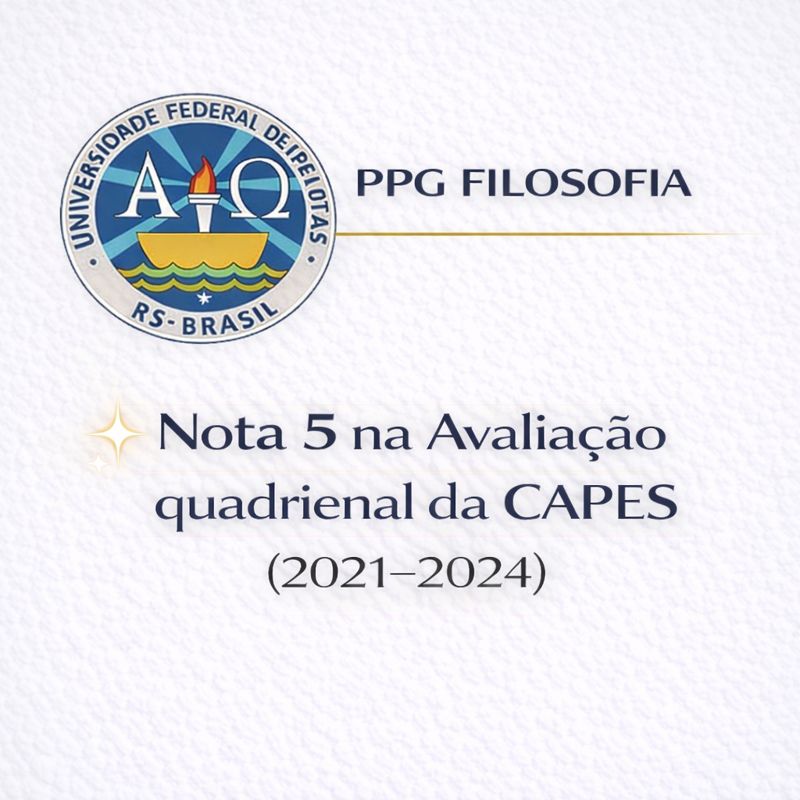 O Programa de Pós-Graduação em Filosofia da UFPel obteve nota 5 na Avaliação Quadrienal da CAPES (2021-2024), reafirmando sua excelência acadêmica, o compromisso com a pesquisa e a formação de mestres e doutores.