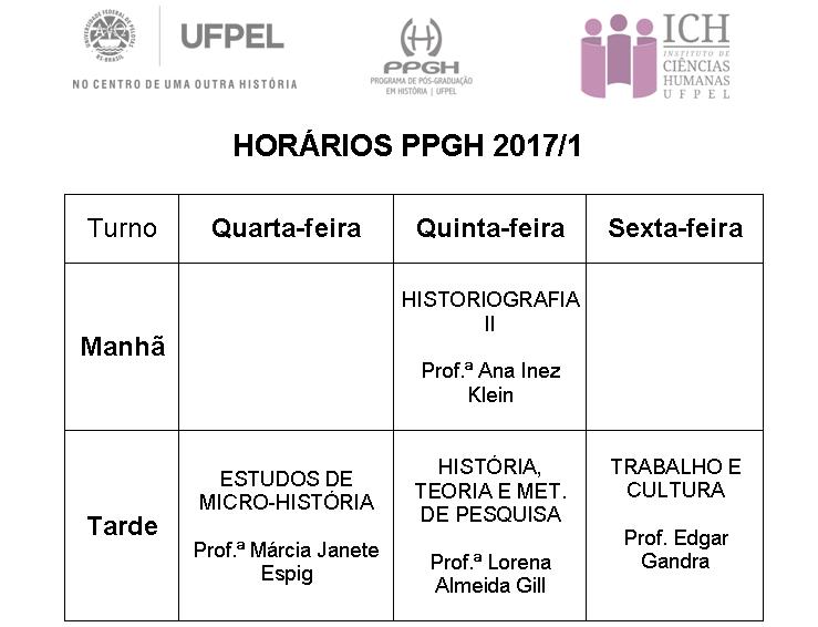 Informamos que os dias para matrícula dos ingressantes no Programa de Pós-Graduação em História da Universidade Federal de Pelotas (Processo Seletivo 2017) ocorrerá nos dias 3/03 (sexta-feira) e 06/03 (segunda-feira), na Secretaria do PPGH (Rua Alberto Rosa, 154 – sala 119), no horário das 13h30min às 18h30min.