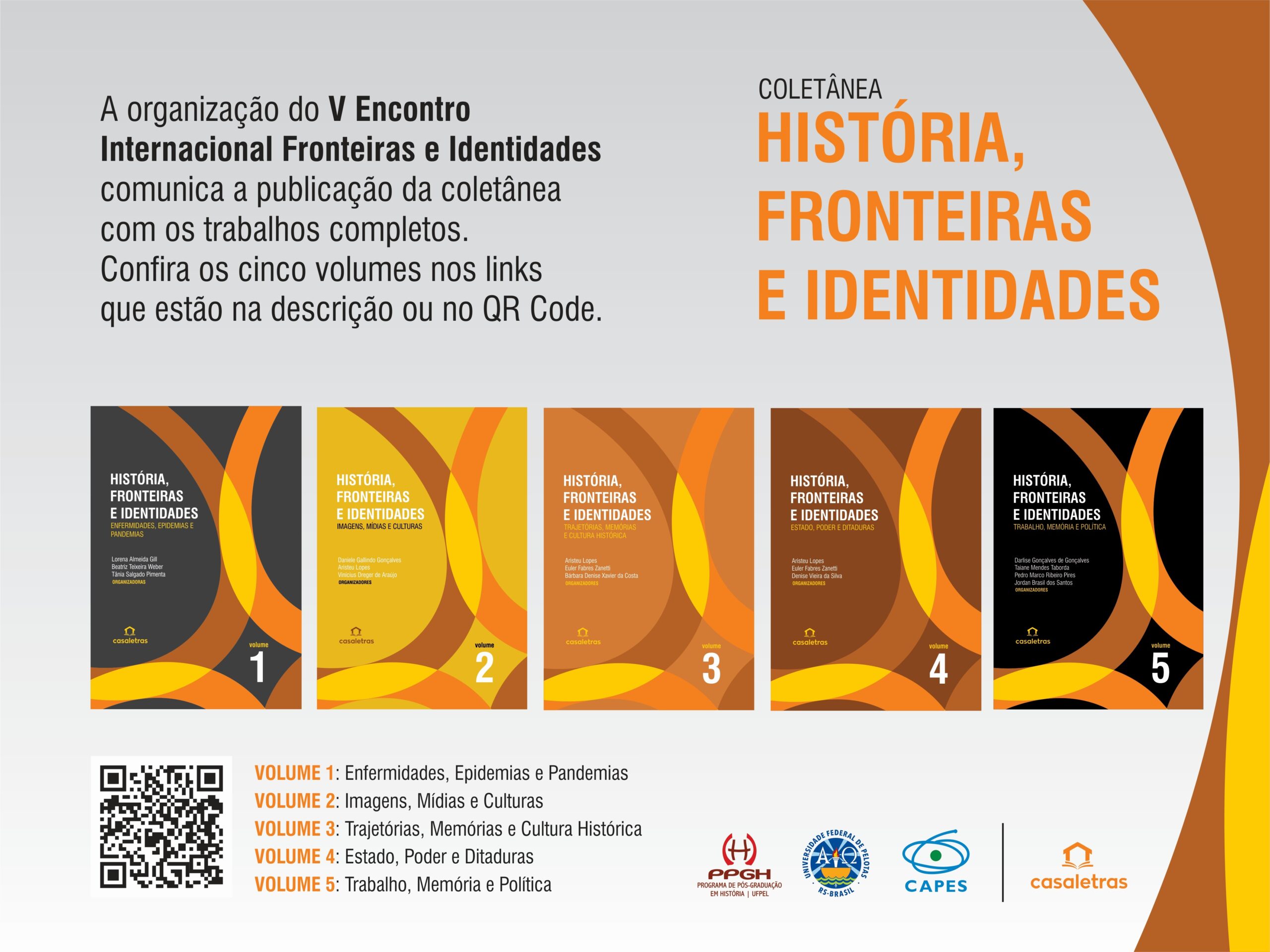 A coletânea História, Fronteiras e Identidades reúne os textos resultantes dos trabalhos apresentados durante o V Encontro Internacional Fronteiras e Identidades – V EIFI – realizado pelo Programa de Pós-Graduação em História da Universidade Federal de Pelotas, entre os dias 14 e 17 de setembro de 2021. Os e-books podem ser acessados pelo QR Code ou diretamente no link: https://www.casaletras.com/eifi