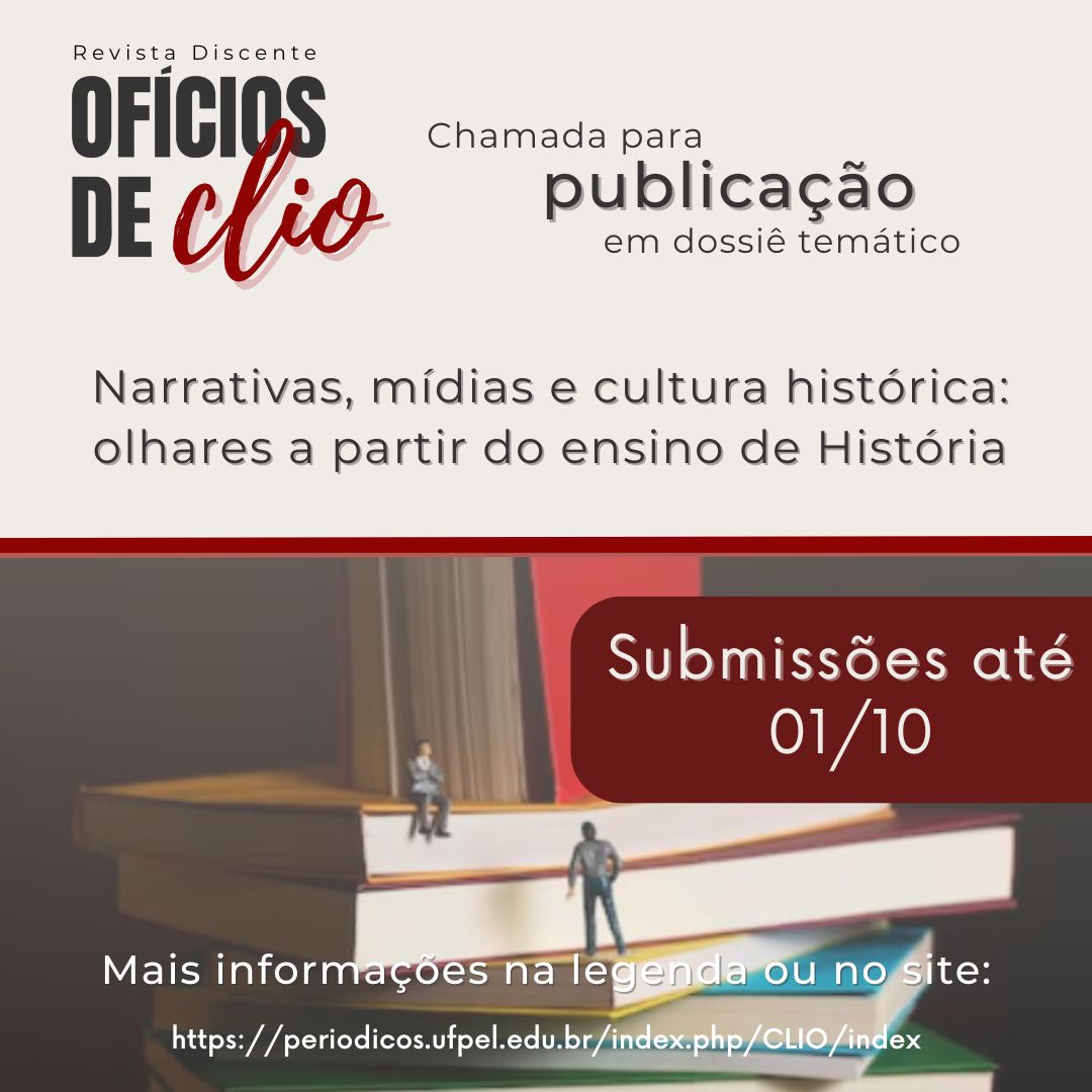 Para nosso décimo sétimo número, a ser publicado no segundo semestre de 2024, estamos efetuando a chamada para o Dossiê Narrativas, mídias e cultura histórica: olhares a partir do ensino de História, sob a proposição das Doutorandas Natiele Gonçalves Mesquita (PPGH/UFPel) e Tayane Ferreira de Almeida (UFPE).