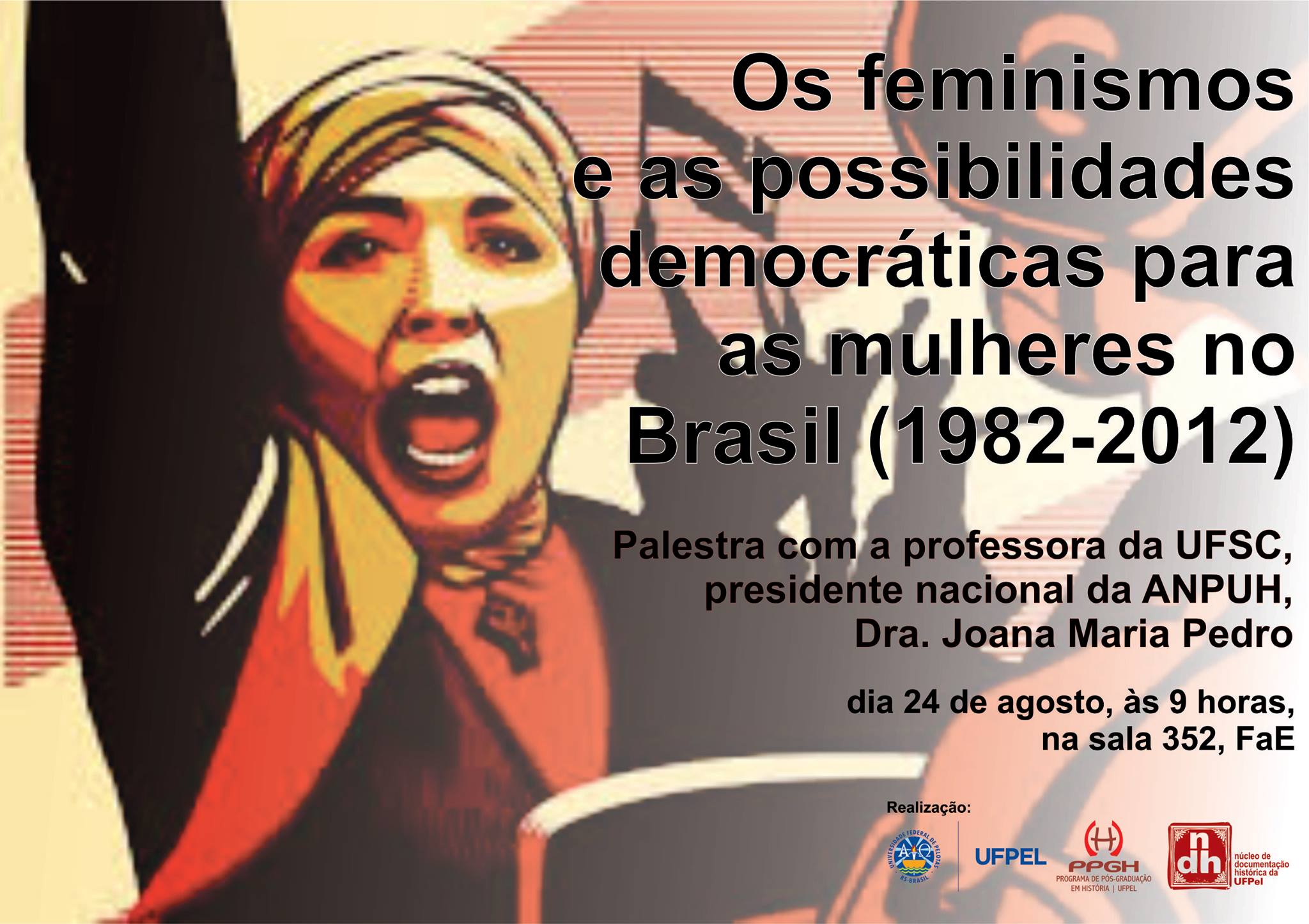 Estão todas/os convidadas e convidados a participarem da palestra com a professora Joana Maria Pedro, presidente nacional da ANPUH, que falará sobre “Os feminismos e as possibilidades democráticas para as mulheres no Brasil (1982-2012)”, no dia 24 de agosto, às 9 horas, na sala 352, FAE.