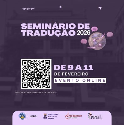 Entre os dias 9 e 11 de fevereiro, acontecerá o Seminário de Tradução 2026, organizado por uma parceria entre a Universidade Federal de Pelotas (UFPel) e a Universidade Federal da Paraíba (UFPB). Para aproximar e divulgar a produção de conhecimentos em tradução produzida em todo o Brasil, este seminário será gratuito e inteiramente on-line, com a seguinte programação: