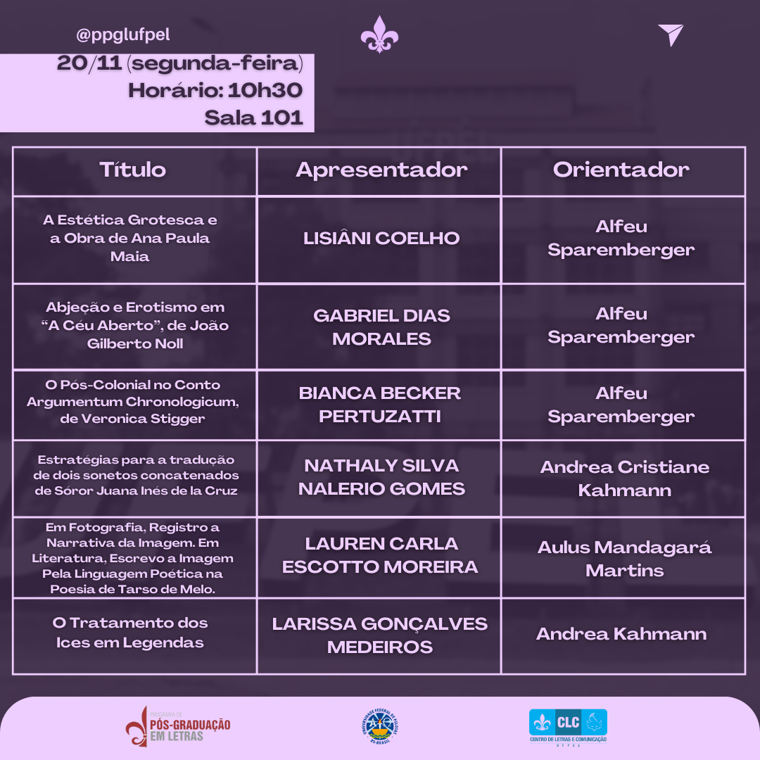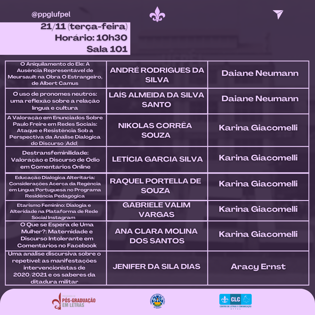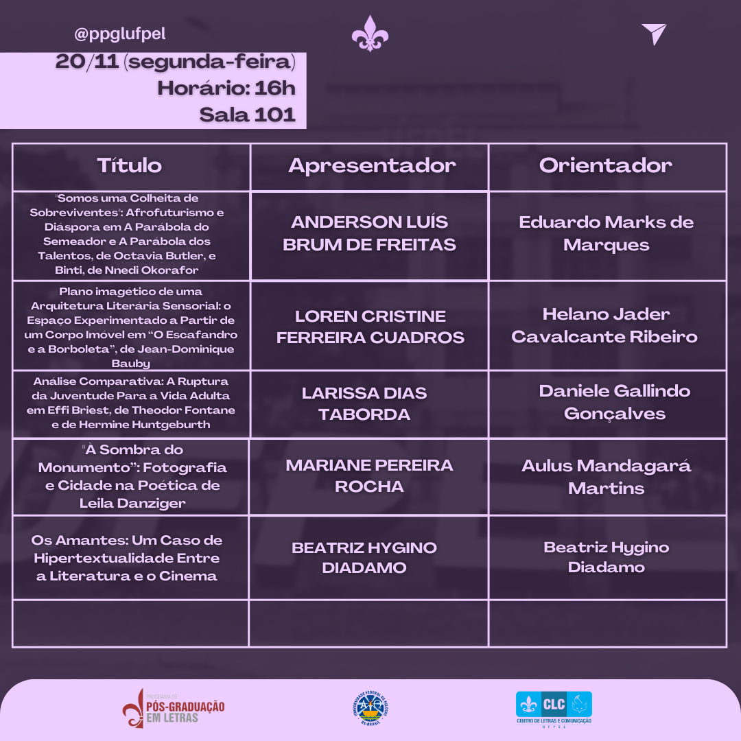 Confira nos cards acima o cronograma completo de apresentação dos alunos do Programa de Pós-Graduação em Letras.