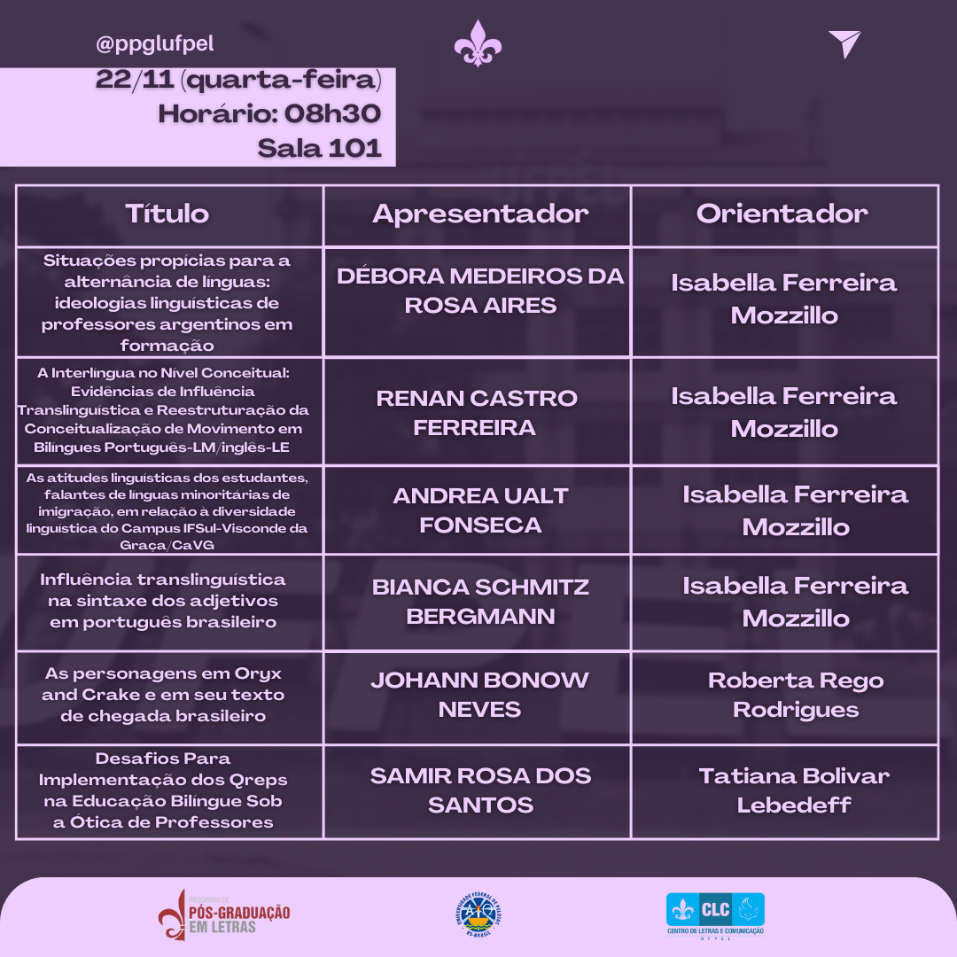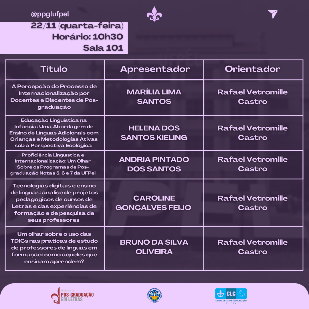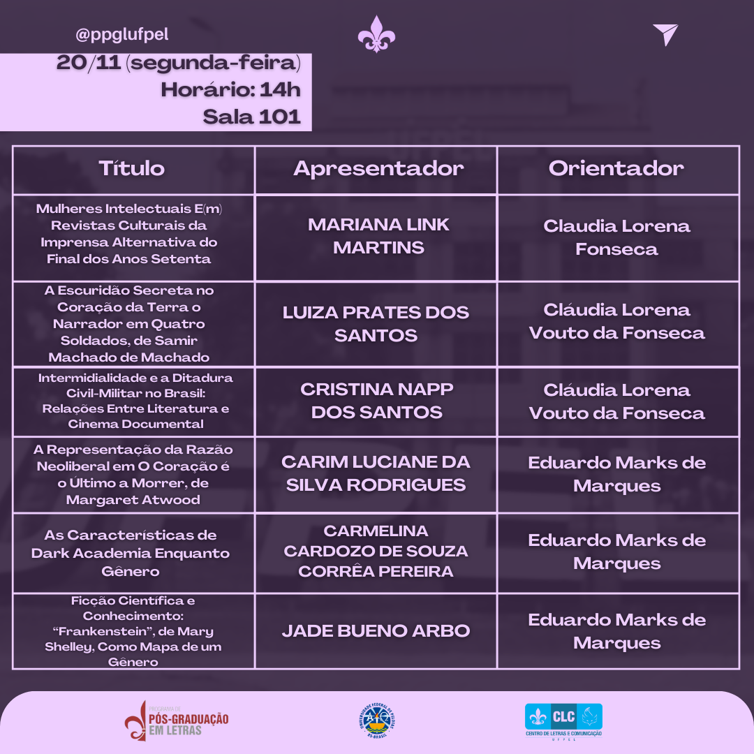 Confira nos cards acima o cronograma completo de apresentação dos alunos do Programa de Pós-Graduação em Letras.