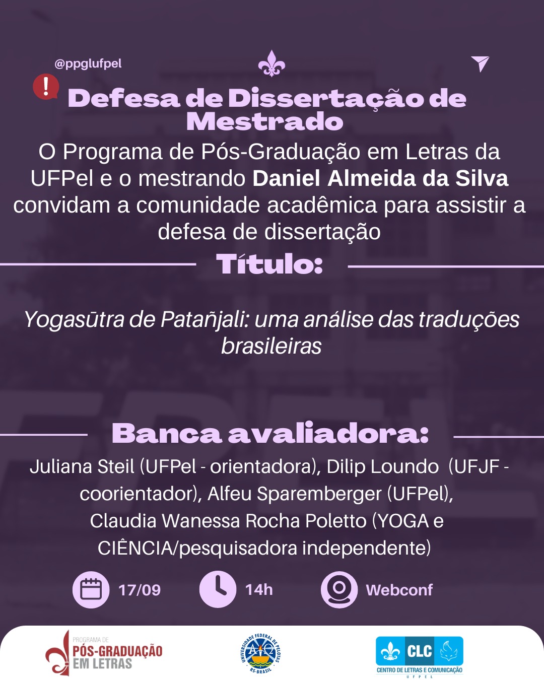 ⚜️ O título de sua dissertação é: “Yogasūtra de Patañjali: uma análise das traduções brasileiras”, e terá como banca os professores: Prof.ª Dr.ª Juliana Steil (UFPel – orientadora), Prof. Dr. Dilip Loundo (UFJF – coorientador), Prof. Dr. Alfeu Sparemberger (UFPel) e Prof.ª Dr.ª Claudia Wanessa Rocha Poletto (YOGA e CIÊNCIA/pesquisadora independente).