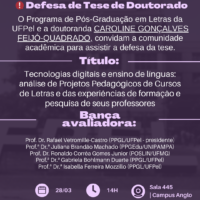 O Programa de Pós-Graduação em Letras convida para a defesa de tese da doutoranda Caroline Gonçalves Feijó-Quadrado. 📖 Título: Tecnologias digitais e ensino de línguas: análise de Projetos Pedagógicos de Cursos de Letras e das experiências de formação e pesquisa de seus professores 📅 Data: 28/03/2025 ⏰ Horário: 14h 📍 Local: Sala 445, Campus Anglo Banca Avaliadora: Prof. Dr. Rafael Vetromille-Castro (PPGL/UFPel, presidente) Prof.ª Dr.ª Juliana Brandão Machado (PPGEdu/UNIPAMPA) Prof. Dr. Ronaldo Corrêa Gomes Junior (POSLIN/UFMG) Prof.ª Dr.ª Gabriela Bohlmann Duarte (PPGL/UFPel) Prof.ª Dr.ª […]