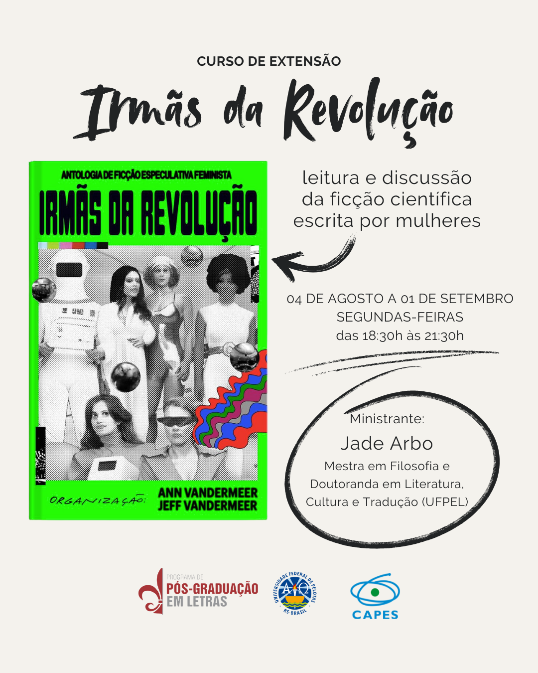 O PPGL promove o curso de extensão Irmãs da Revolução: leitura e discussão da ficção científica escrita por mulheres, organizado pela doutorandao Jade Bueno Arbo. O curso propõe uma imersão crítica em narrativas que reconfiguram as relações entre ciência, sociedade e gênero. A partir da leitura e discussão de contos da coletânea “Irmãs da Revolução”, veremos como essas obras desafiam dualismos tradicionais – razão/emoção, humano/natureza, masculino/feminino – e contribuem para debates epistemológicos, políticos e ecológicos.