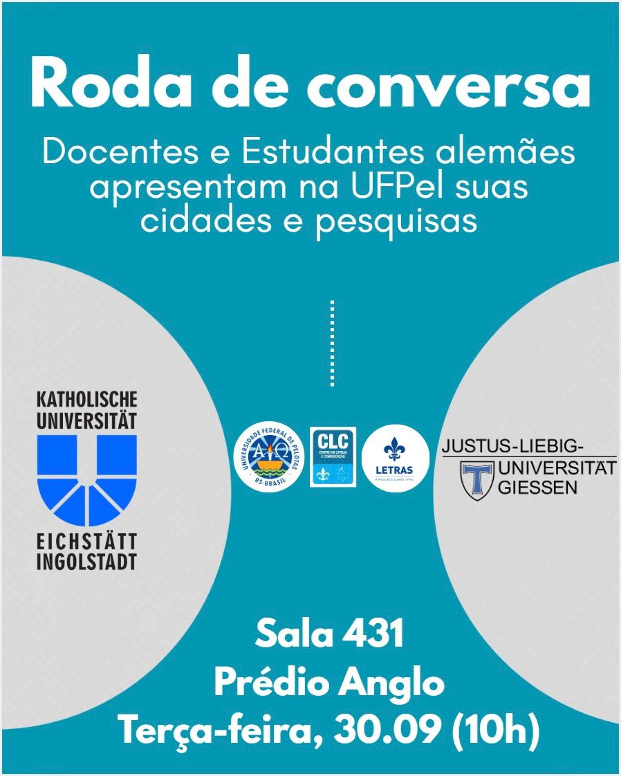 No dia 29 de outubro, às 10h, a UFPel e o Curso de Letras – Português e Alemão do CLC recebem um grupo de docentes, doutorandos e mestrandos da Justus-Liebig-Universität de Gießen e da Universidade Católica de Eichstätt-Ingolstadt .