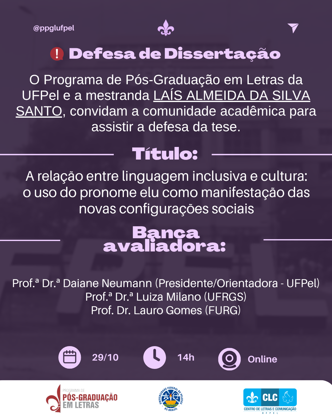 #PPGL #UFPel #DefesaDeDissertação #LinguagemInclusiva #Cultura #Letras #Mestrado #PósGraduação #Linguística #PesquisaAcadêmica