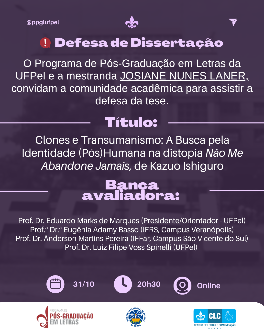 #PPGL #UFPel #DefesaDeDissertação #Literatura #KazuoIshiguro #Transumanismo #Distopia #Letras #PósGraduação #PesquisaAcadêmica #NãoMeAbandoneJamais