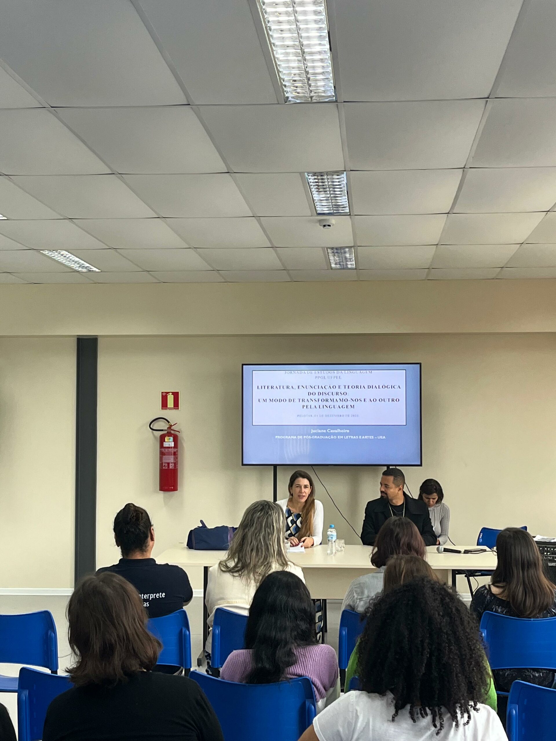 A palestra de abertura ficou a cargo da Prof.ª Juciane Cavalheiro, da Universidade Federal do Amazonas, que trabalha com as interfaces entre linguística e literatura a partir das teorias de enunciação.
