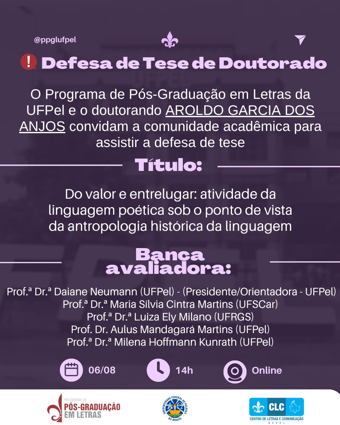 📢 O Programa de Pós-Graduação em Letras convida para a defesa da tese de doutorado de Aroldo Garcia dos Anjos.