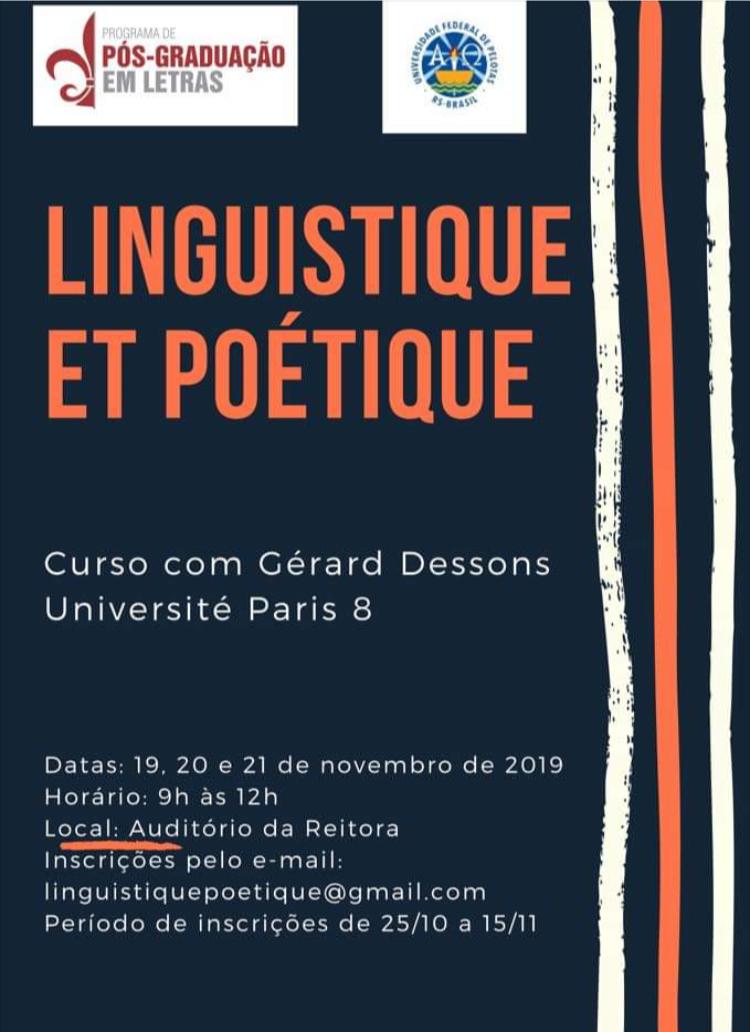 Nos dias 19, 20 e 21 de novembro, o Programa de Pós-Graduação em Letras da UFPEL estará recebendo o Prof. Gérard Dessons, da Universidade de Paris 8, para ministrar o curso “Linguistique et poétique”.